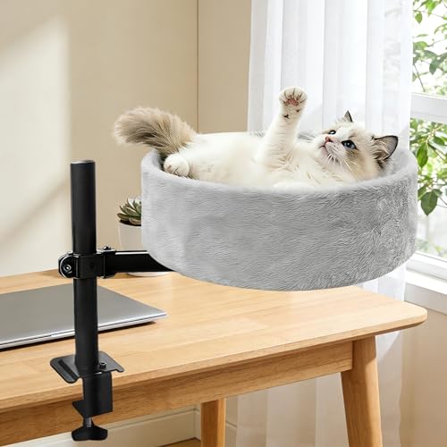 Cat Desk Bed,360° Rotating & Height Adjustable Desk Cat Bed,Space Saving Modern Indoor Cats Nest Furniture Cozy Faux Fur Pet Nest Perch Hammock for Various Desktops,15.7″ L*15.7″ W*16.9″ H,Grey