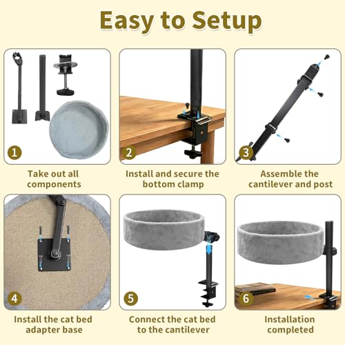Easy Assembly & After-Sales Service:This cat bed for desk includes a clear installation manual, with drill-free and tool-free assembly in only a few simple steps – easy even for first-time users. Perfect for office workers, gamers, cat lovers and renters. Note: Tighten all screws securely all the way through installation.In case you have any product problems, please contact us, we can try our best that can assist you solve it.