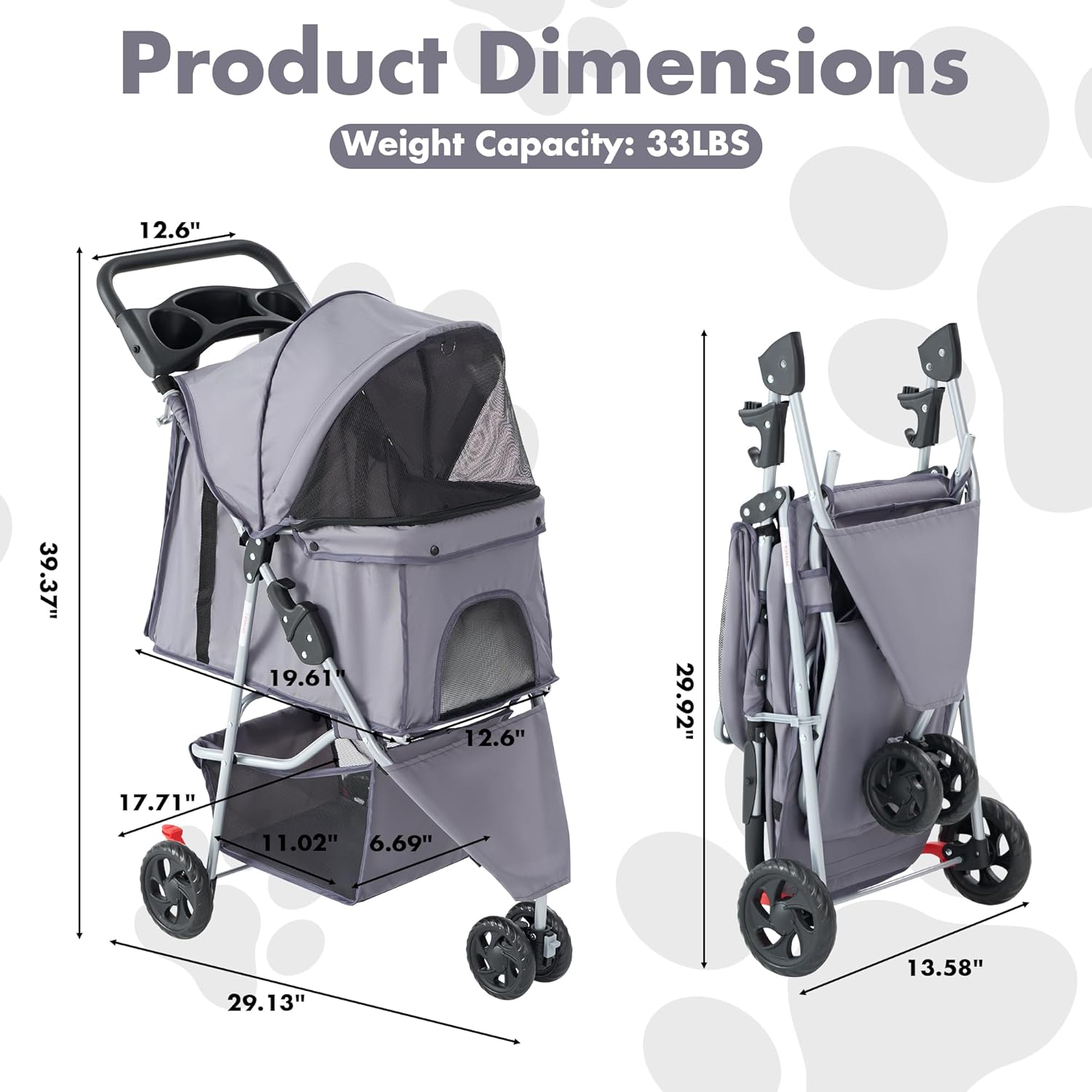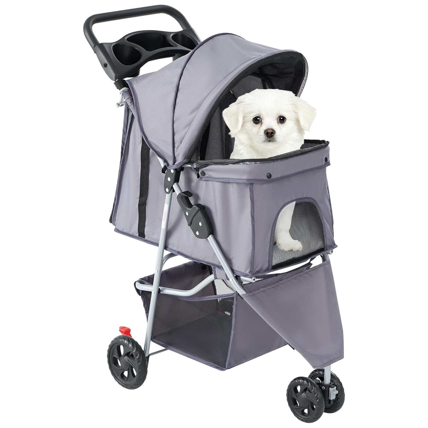 Extra Storage: Equipped with a large undercarriage basket and cup holders, this stroller offers ample storage for pet supplies, toys, snacks, and personal items. The waterproof fabric and easy-to-clean materials ensure hassle-free maintenance.
