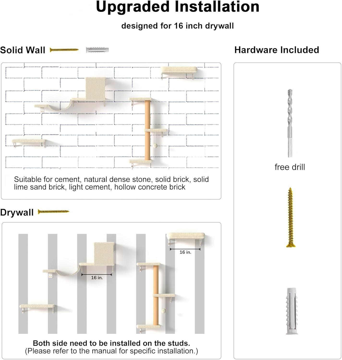 EASY TO INSTALL – The modular cat wall shelves are designed for US standard 16 inch drywall, through scientific arrangement, each bracket can be installed on the wood stud. Greatly reduced the complexity of the installation and increase the stability, even you are a fresh man for cat climbing wall installation, you won’t feel difficult.