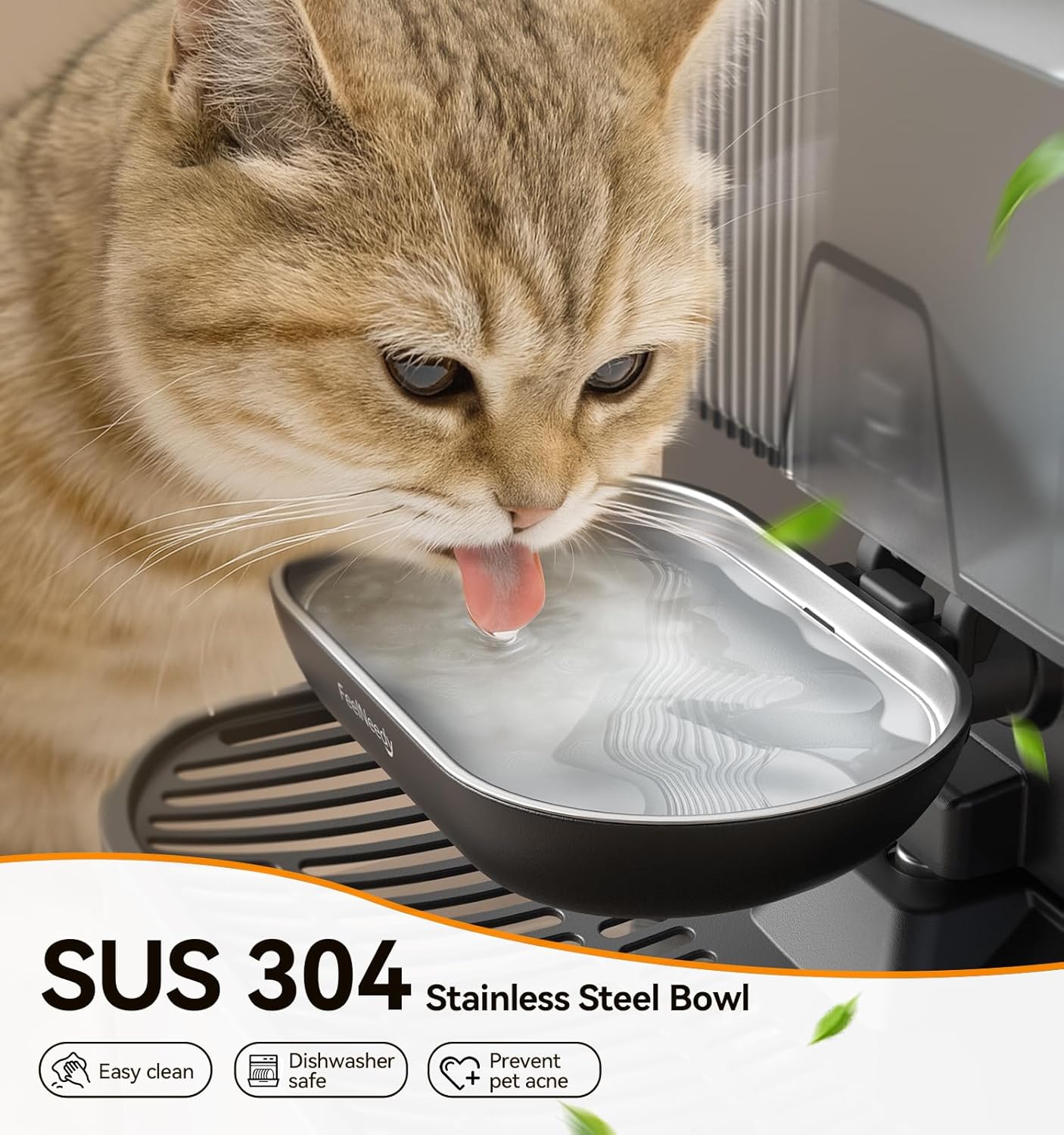 304 Stainless Steel Bowl – The drinking surface uses 304-safe, rust-resistant stainless steel (clean/waste tanks: durable plastic) to prevent bacterial buildup and pet acne. Smudge-proof and easy to clean, it ensures worry-free hydration