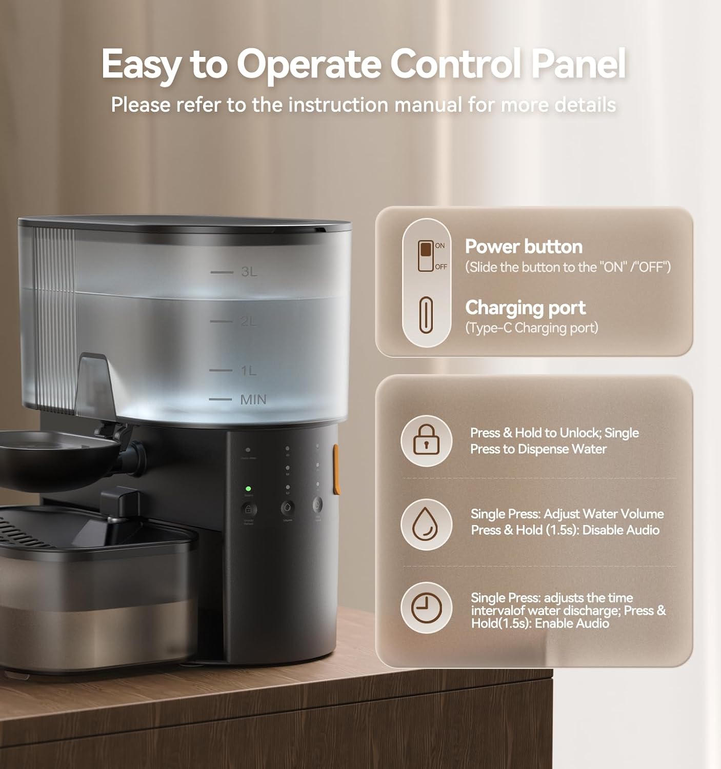 180 Days Cordless Freedom – Powered by a 2,000mAh USB-C rechargeable battery, this fountain runs cordlessly for up to 6 months per full charge. The 3.5L clean-water tank lasts 3–9 days, ideal for homes, balconies, or travel. Keep pets hydrated effortlessly, even when you’re away