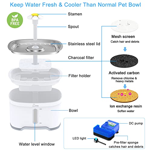 High-grade stainless-steel top is durable, hygienic and dishwasher safe. Pet fountain includes stainless steel top, 3 carbon filters, 1 foam filter, and 2 spouts. 3 replacement filters instead of 1. No need to purchase filters immediately. Food grade material and BPA free cat fountain is safe for your pets.